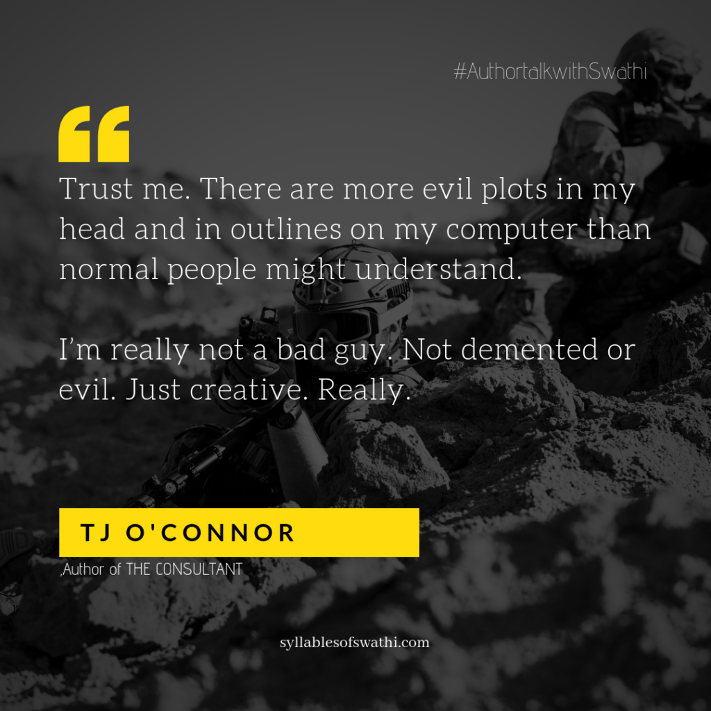Author Tj O’Connor is here on the Blog, and I am so pleased to introduce him and his recent Action Flick The Consultant, which released earlier this year. Click here for my full review. Scroll through and read through the session where O’Connor talks about his characters and how he makes them too dangerous to touch, his real life Consulting Job in Washington DC, his next project! There is also the details of his book and the link to enter the Giveaway – You could WIN a copy of this fantastic book if you enter! All best!