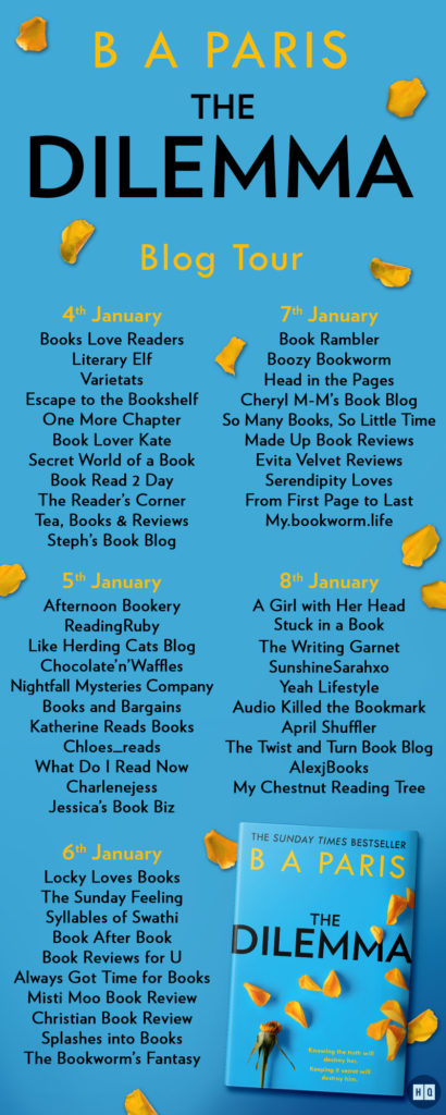 The Dilemma is a story with a LOT of secrets (pfff obviously!!!), denial, betrayal, rejection that happens within a family and the love and compassion that still keeps them together through thick and thin. Completely absorbing read recommended highly, if you’re looking for a pacy domestic thriller. Many thanks to HQ for having me on the very special, official blog tour where FIFTY bloggers talk about this lovely book. So proud to be on this!