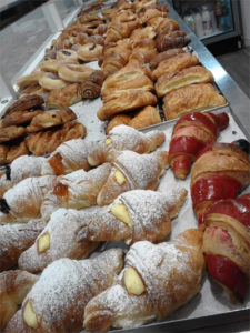 There are pastries: amaretti, pizzelle, zuccotto, ricciarelli, cantuccini, schiacciata, buccellati, just to name a few. On a trip with Flynn, Toscana eats a flaky, warm chocolate cornetto (the Italian version of the croissant). At Maria’s bakery she sees chiacchere, a sweet dough that’s fried and coated with powdered sugar.