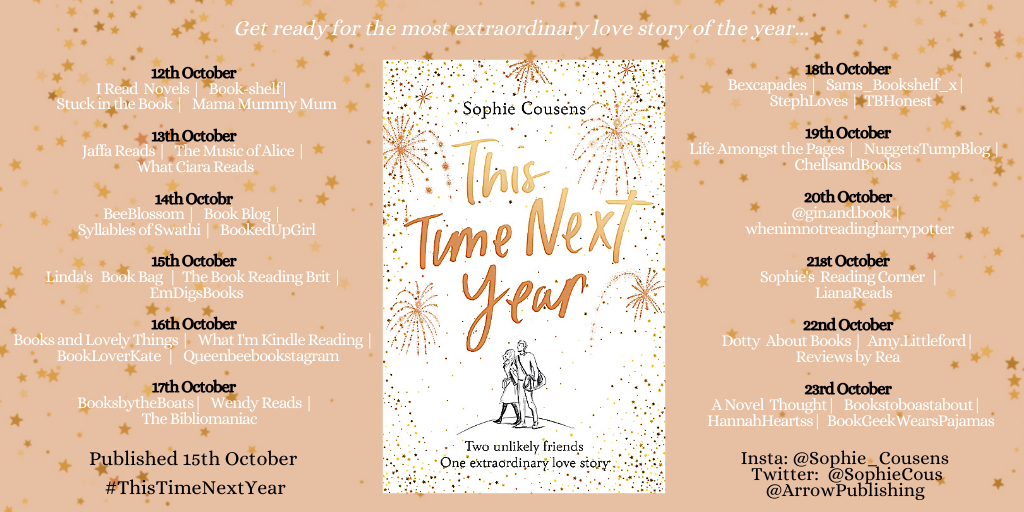 Overall, This Time Next Year is a pleasant, fast-paced, uplifting romantic comedy to binge read with coffee and cuddles. My sincere thanks to Arrow and Penguin Random UK for having me on the official blog tour and Rachel Kennedy for sending me the gorgeous paperback.