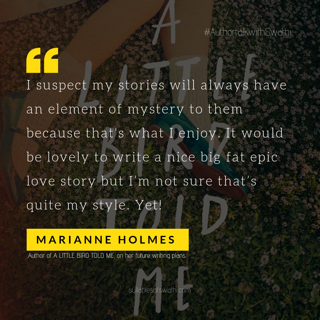 Author Interview with Marianne Holmes Hello everyone! How have you been this October? Hope all is well with y’all! It is my pleasure to invite and introduce Marianne Holmes today at Syllables of Swathi! She is none other than the author of the best selling Literary Fiction A little Bird Told Me, that released earlier this year! Click here to read my full review of the book, and enjoy the blurb of it! Read further to learn more about this Marianne and her lovely book. She also shares her writing experiences, and talks about her inspiration, favorite authors and her pet fishes – Infinity Flame and Mars!!! Author Biography: Marianne…
