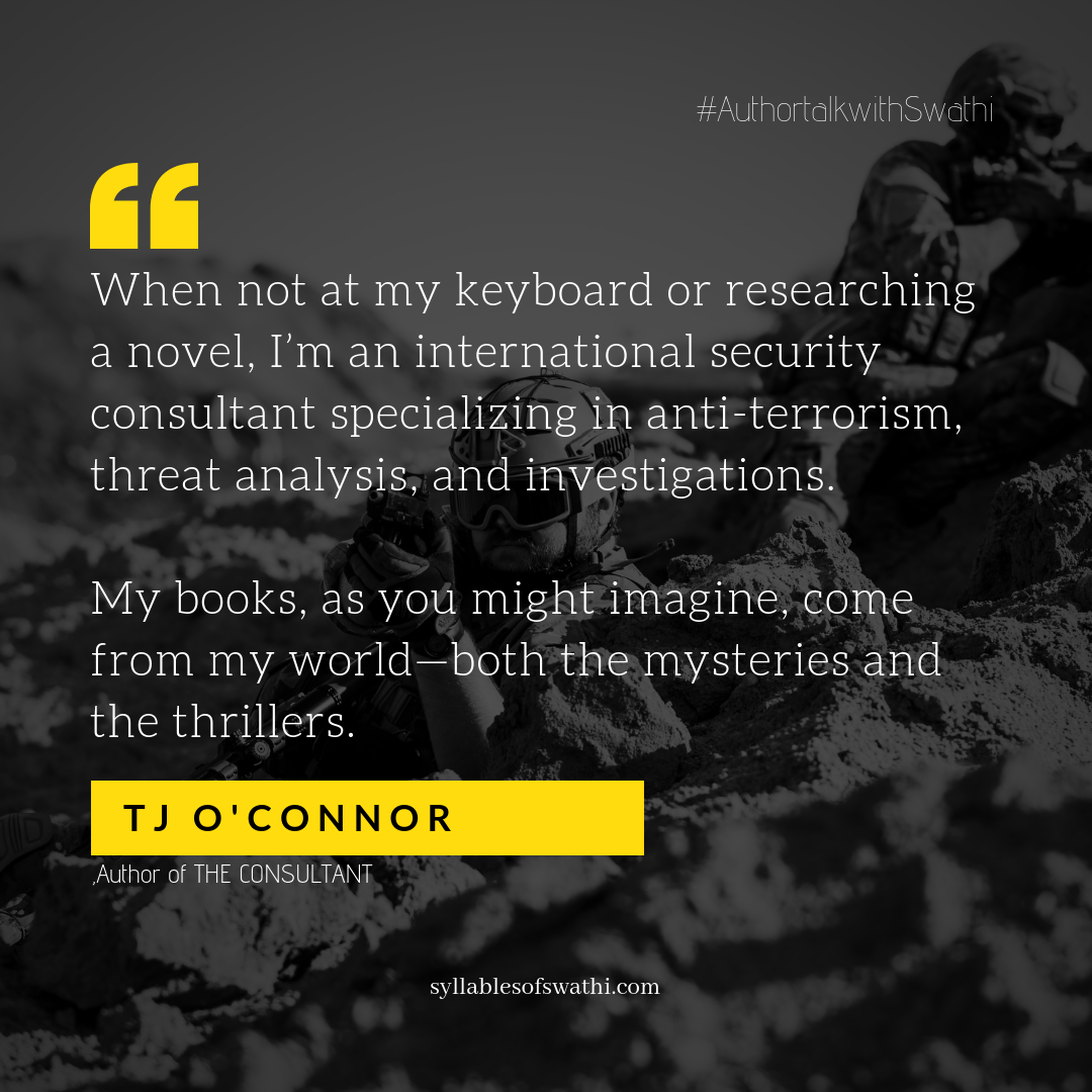 Author Tj O’Connor is here on the Blog, and I am so pleased to introduce him and his recent Action Flick The Consultant, which released earlier this year. Click here for my full review. Scroll through and read through the session where O'Connor talks about his characters and how he makes them too dangerous to touch, his real life Consulting Job in Washington DC, his next project! There is also the details of his book and the link to enter the Giveaway - You could WIN a copy of this fantastic book if you enter! All best!